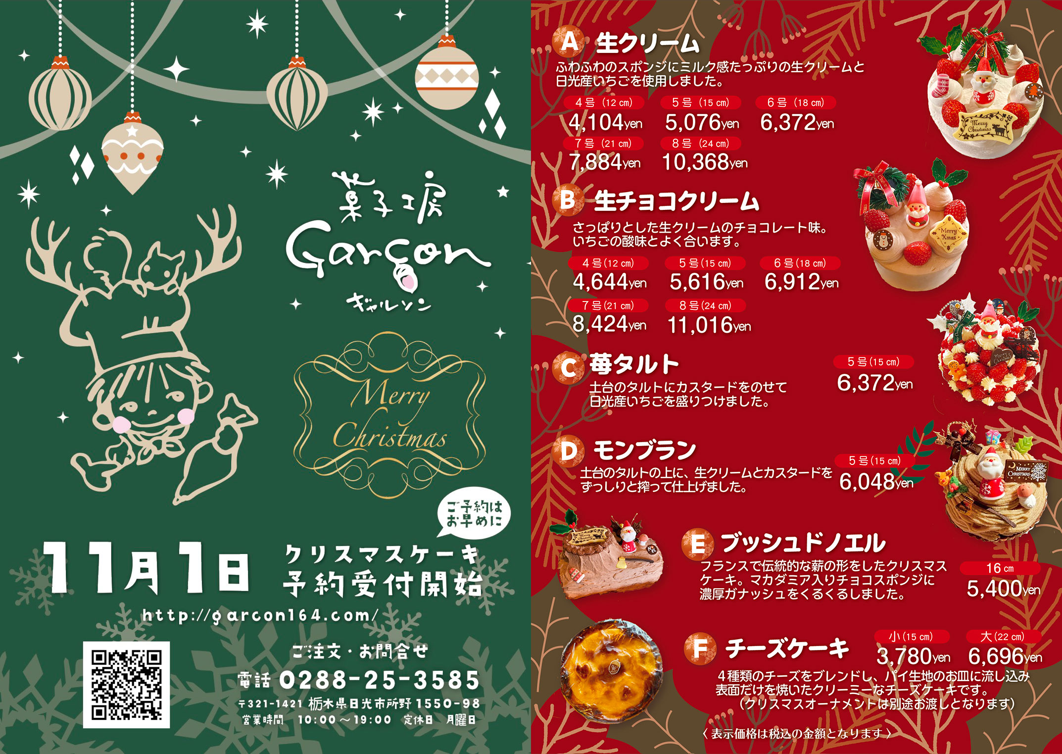 菓子工房ギャルソンでは、皆様に素敵なクリスマスを過ごしていただけるよう6種類のケーキをご用意しました。
